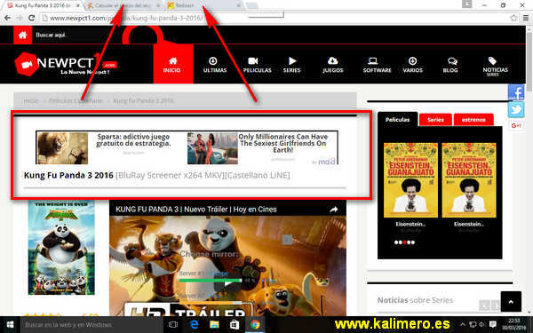 Aquí vemos que también tienen publicidad estática en el recuadro rojo, (esa es asumible y no me oiréis quejarme de ello), pero a la vez vemos que solo entrar ya se han abierto 2 nuevas páginas, a donde se me redirigió inmediatamente. Os aseguro que es una odisea, porque lo he probado, buscar un documental o aplicación para bajar el torrent y llegar hasta el final. Una media de 7 u 8 intentos frustrados no te los quita nadie.