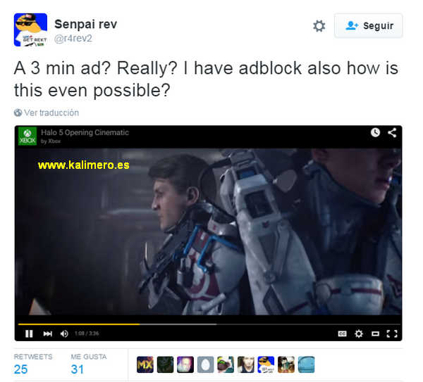 Pero parece ser que el propio Google Chrome es sospechoso de poner código en su navegador para evitar que estos bloqueadores de publicidad funcionen en algunos lugares, como por ejemplo en Youtube. Aquí vemos un tweet de alguien que lleno de perplejidad, no entendía como SOLO con Chrome no podía evitar un video de 3 minutos de publicidad antes de poder visualizar el vídeo que quería ver.